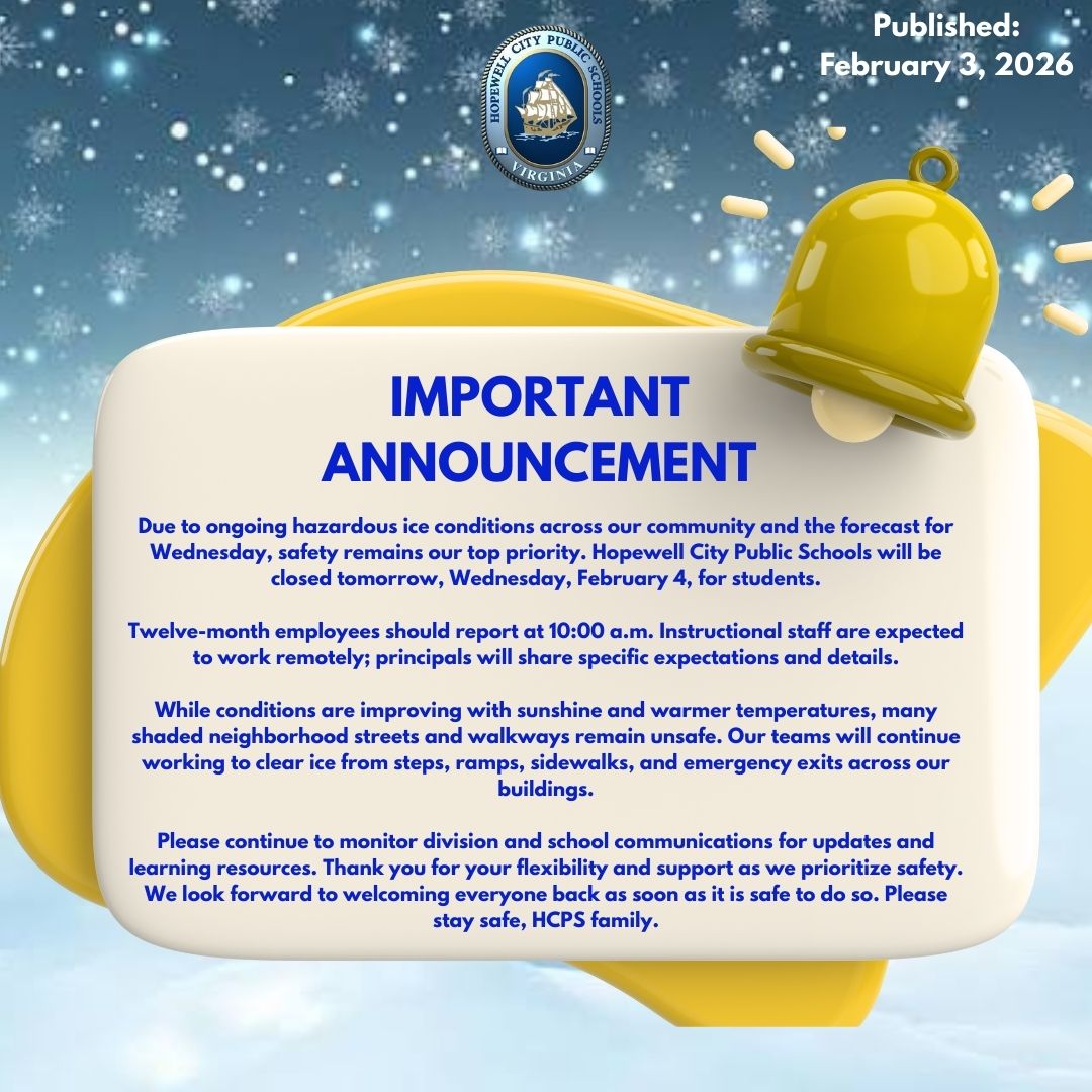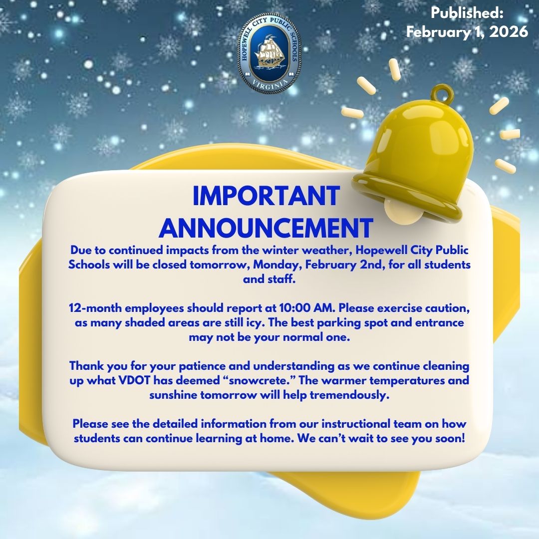 Hopewell City Public Schools will Operate on a 2-Hour Delay on Thursday, February 5, 2026