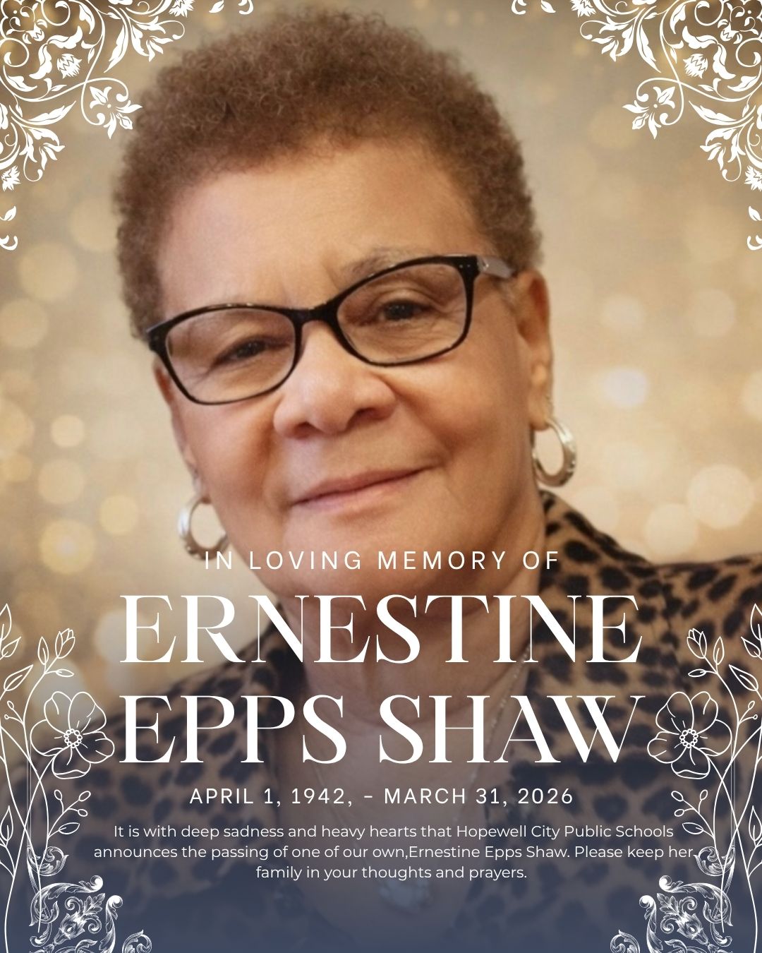 It is with deep sadness and heavy hearts that Hopewell City Public Schools announces the passing of one of our own, Ernestine Epps Shaw. Mrs. Shaw faithfully served in Food Services from 2008 to 20...