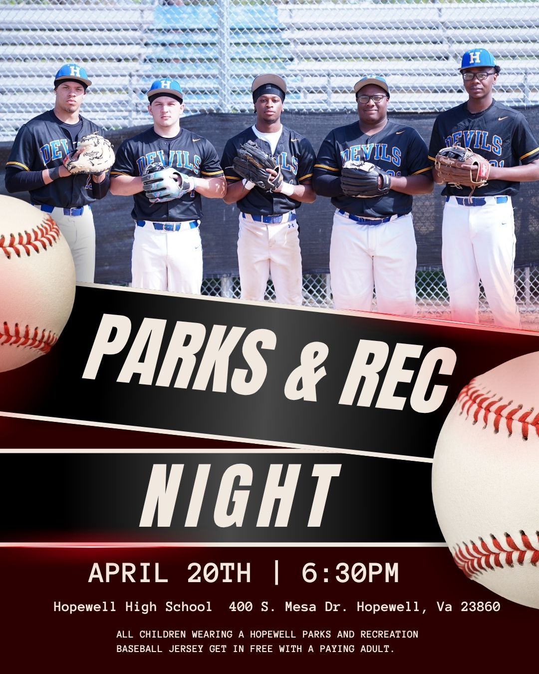 Join us for Parks & Rec Night on April 20th at 6:30pmWe’re excited to welcome our Hopewell Parks & Recreation baseball players to cheer on the Blue Devils. All children wearing a Hopewell P...