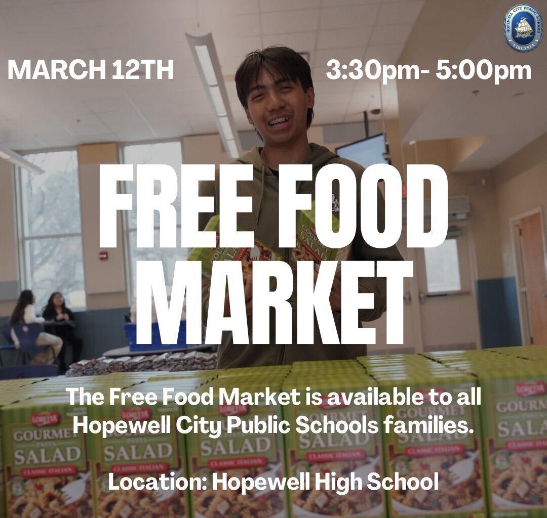 The Food Market will be open at Hopewell High School on Thursday, March 12th from 3:30–5:00 PM for HCPS families. Stop by to pick up free food for your household, we look forward to seeing you there!