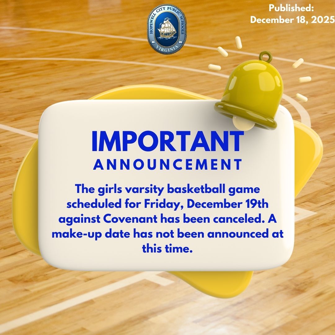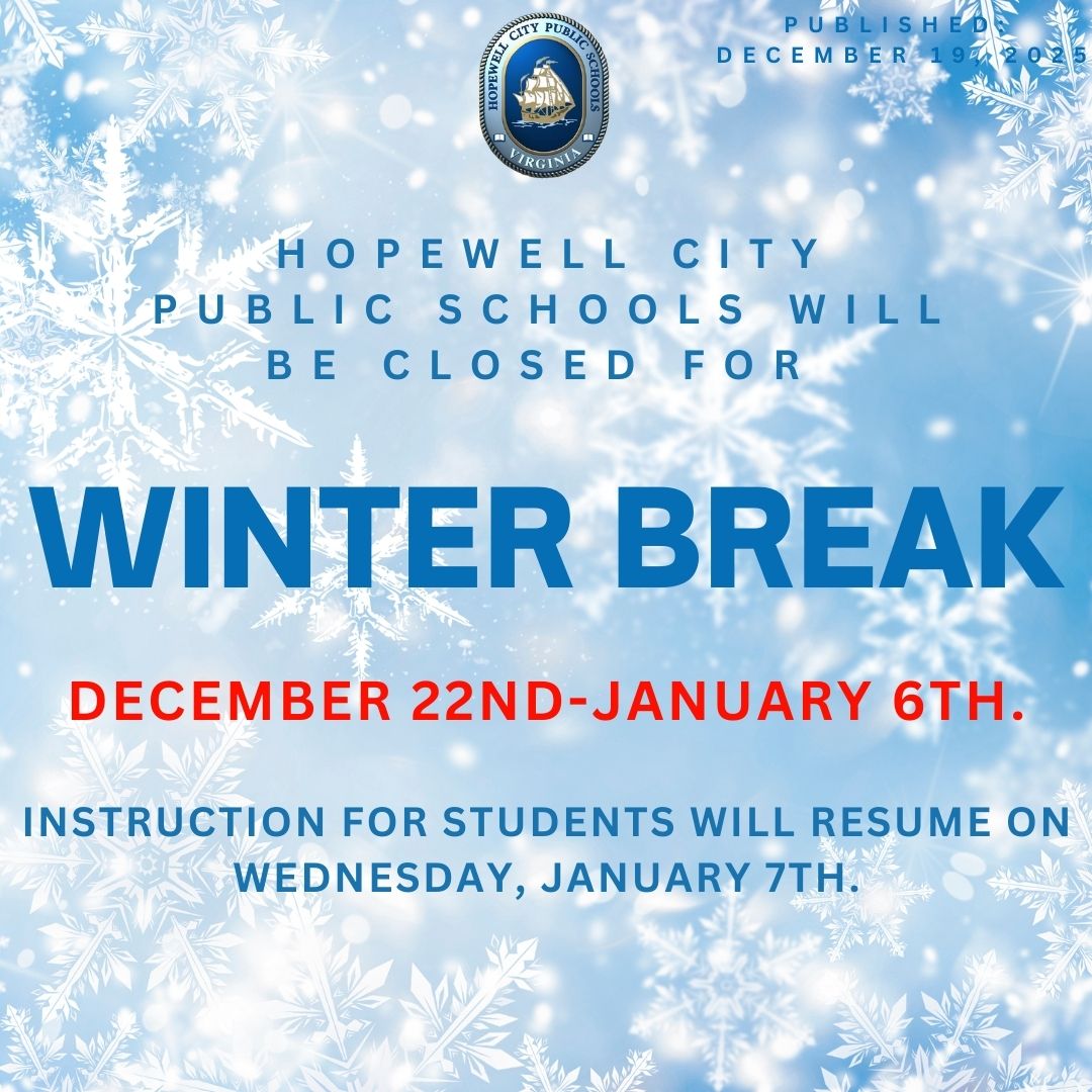 Hopewell City Public Schools will be closed for Winter Break December 22nd-January 6th. Instruction for students will resume on Wednesday, January 7th. Have a safe and fun Winter Break HCPS family.