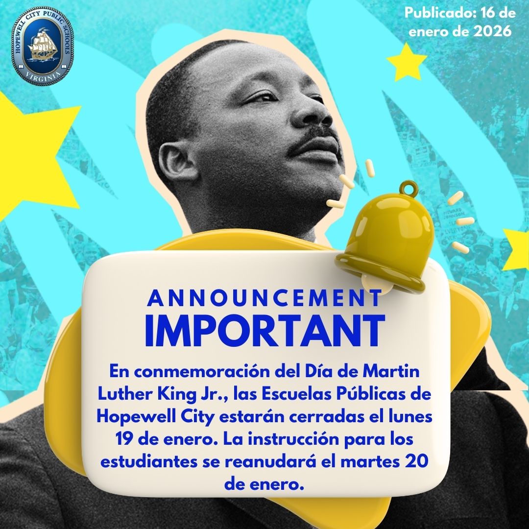 In observance of Martin Luther King Jr. Day, Hopewell City Public Schools will be closed on Monday, January 19th. Instruction for students will resume on Tuesday, January 20th.