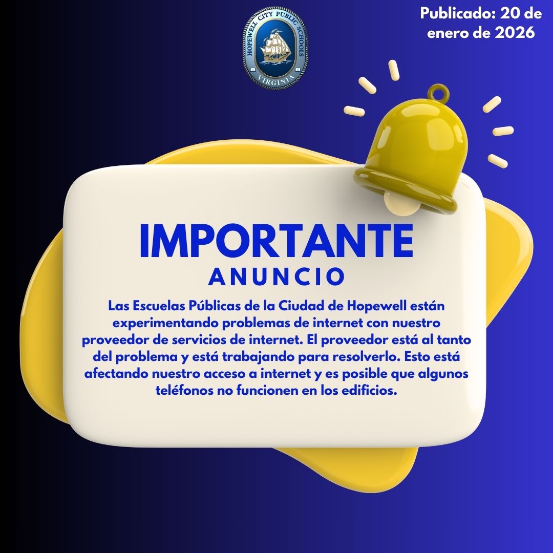 Hopewell City Public Schools is currently experiencing internet issues with our Internet Service Provider. The Provider is aware of the issue and is working to resolve it. This is currently affecting our internet access and some phones may be down at the buildings.