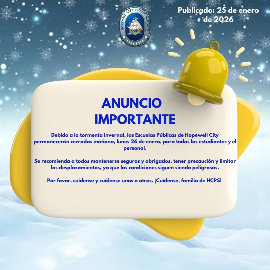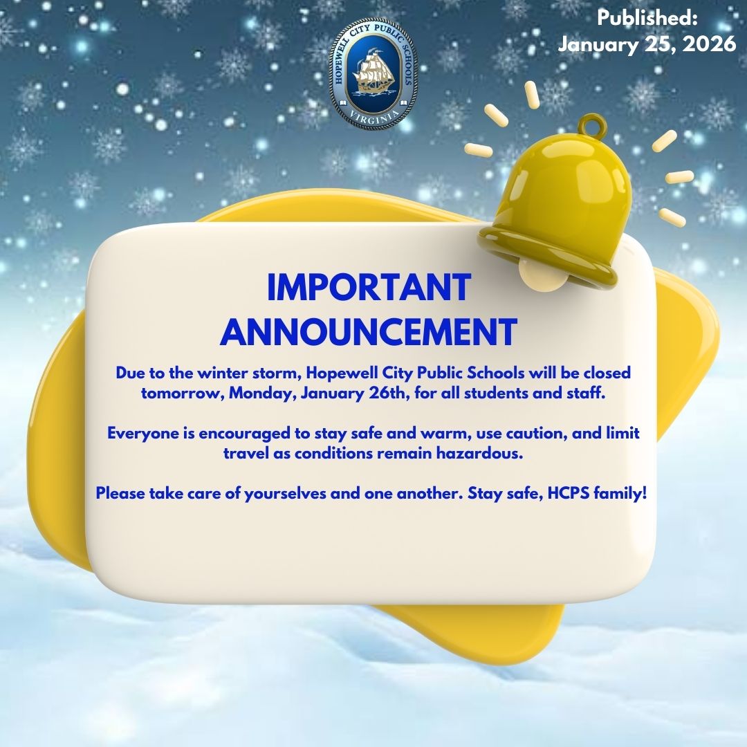 Hopewell City Public School will be Closed Monday, January 26, 2026