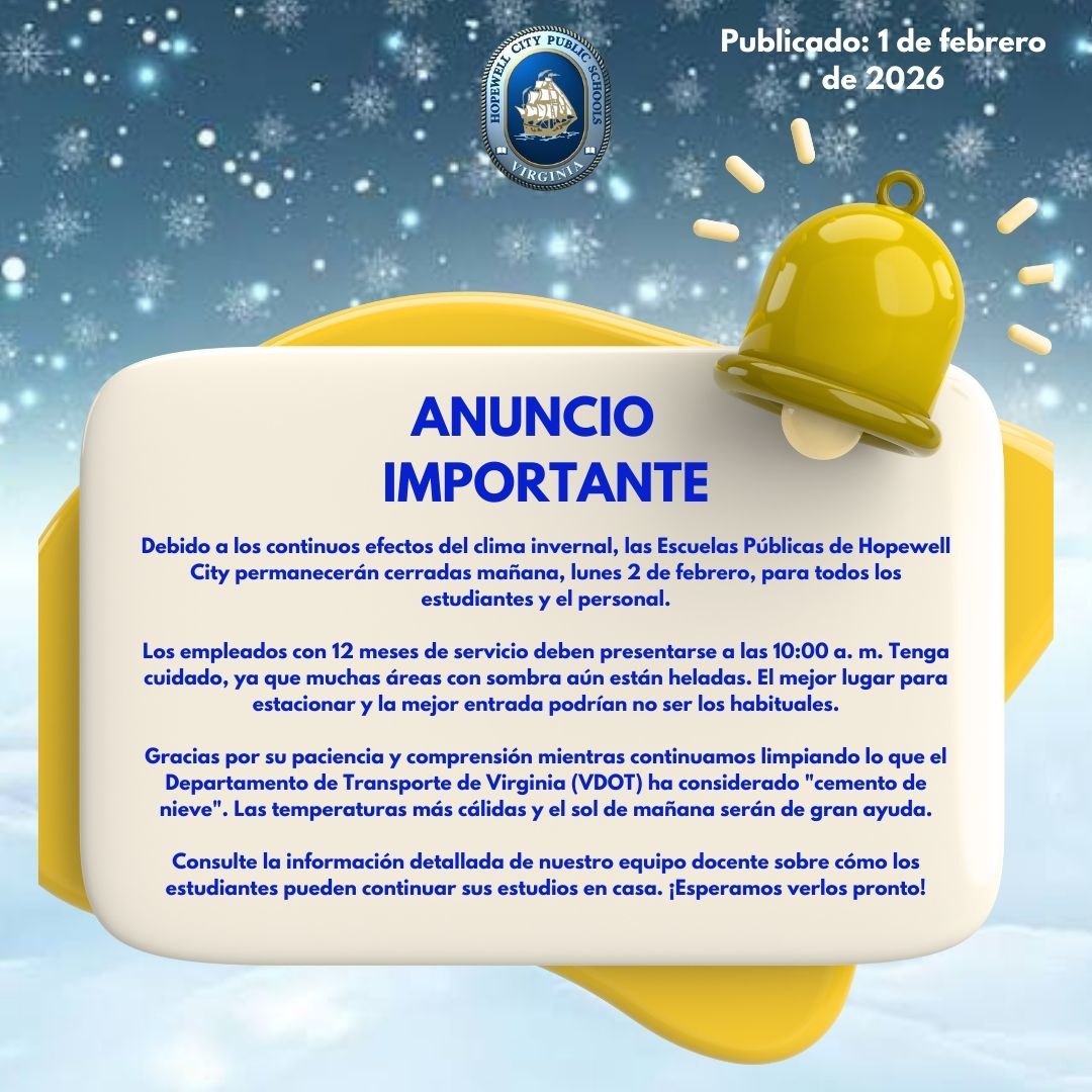 Hopewell City Public Schools will be Closed on Monday, February 2, 2026