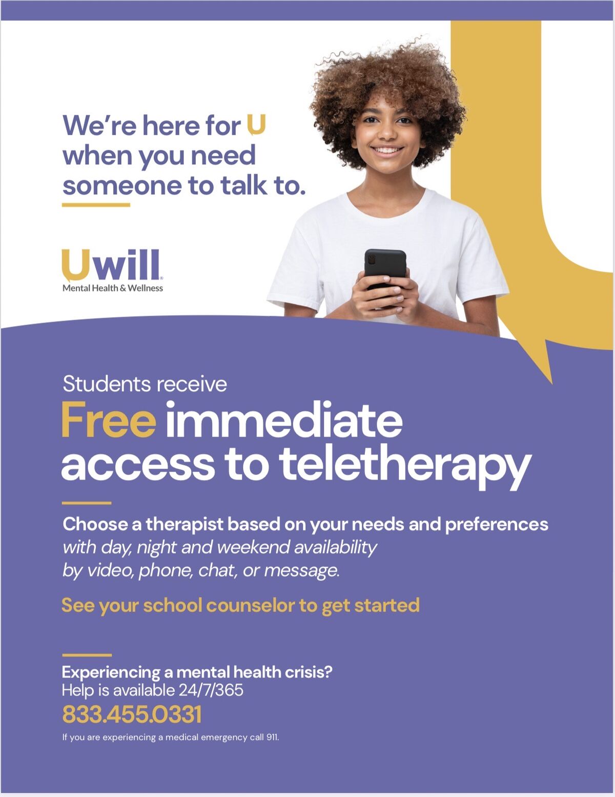 Students experiencing grief or sadness can access UWill for support, please see your counselor for more information; this service is available for middle and high school students. See you tomorrow.